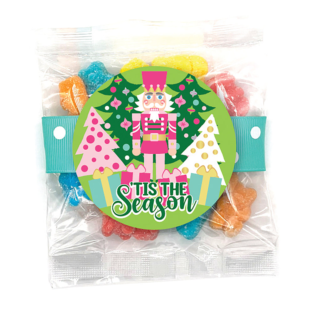 This plastic pint jar has about 13 ounces of candy. The regular treat bags have 6 ounces of candy. The small treat bags have 3 ounces of candy each. The jars and bags are decorated with blue and green ribbon and has a Holiday themed label.