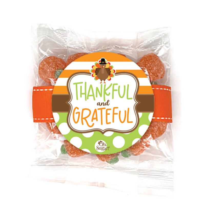 This plastic pint jar has about 13 ounces of candy. The regular treat bag has 6 ounces of candy. The small treat bags have 3 ounces of candy each. The jars and bag are decorated with orange and apple green ribbon with a Fall themed label.