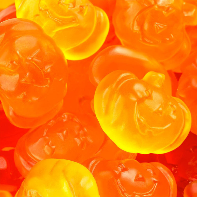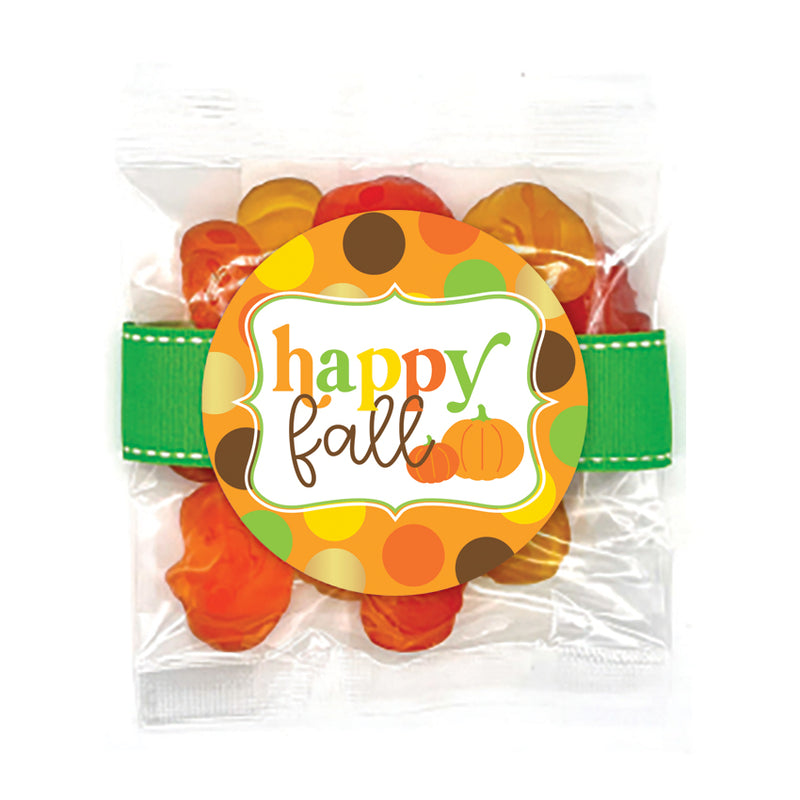 The pint jar has about 13 ounces of candy. The regular treat bag has 6 ounces of candy. The small treat bags have 3 ounces of candy each. The jars and bag are decorated with orange and apple green ribbon with a Fall themed label.