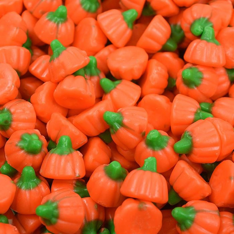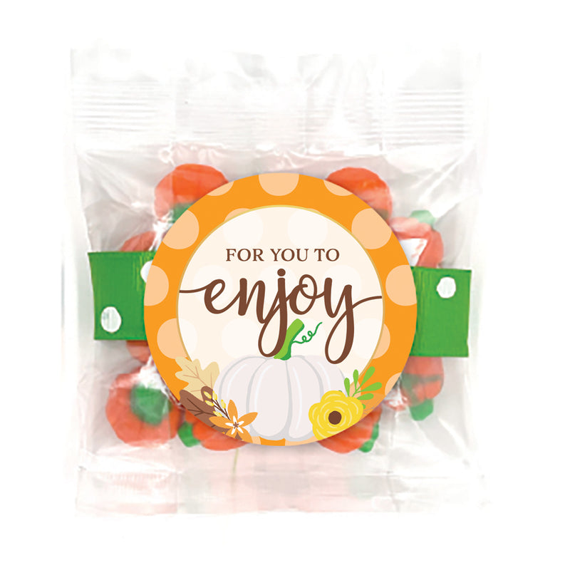 The pint jar has about 12 ounces of candy. The regular treat bag has 6 ounces of candy. The small treat bags have 3 ounces of candy each. The jars and bag are decorated with orange and apple green ribbon with a Fall themed label.