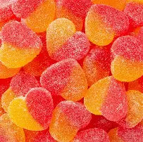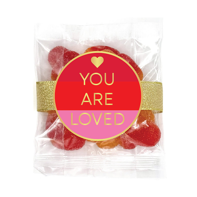 This plastic pint jar has around 13 ounces of Valentine Peachy Gummy Hearts. The regular treat bags have 6 ounces of candy. The small treat bags have 3 ounces of candy each. The jar and bags are decorated with red ribbon and have a Valentine's Day themed label.