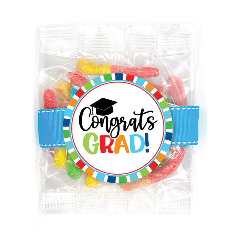 This plastic pint jar has about 13 ounces of candy. The regular treat bags have 6 ounces of candy. The small treat bags have 3 ounces of candy each. The jar and bags are decorated with blue ribbon and has a Graduation themed label.