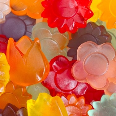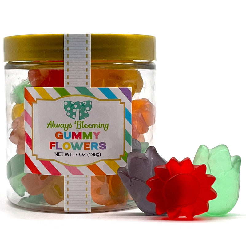 This acrylic container holds seven ounces of Mini Gummy Flowers. The jar is decorated with a wrap around label.