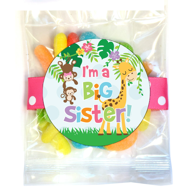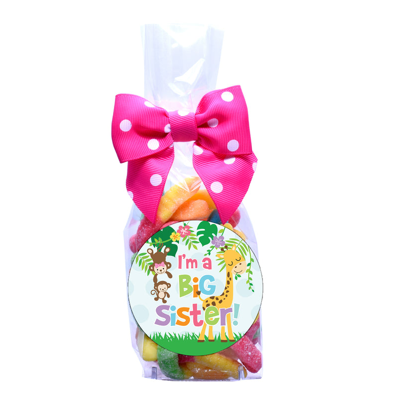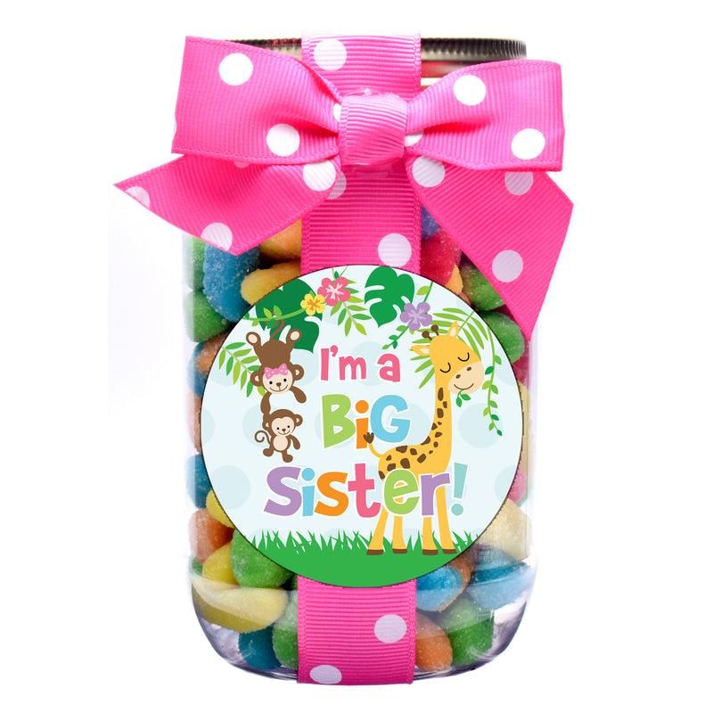 Depending on your candy selection (some candy weighs more than others) the plastic pint jar holds between 9oz - 13oz of candy. The regular treat bag holds 4oz - 6oz of candy and comes with a twist tie bow. The small treat bags have 2oz - 3oz of candy each. The jars and bags are decorated as shown.