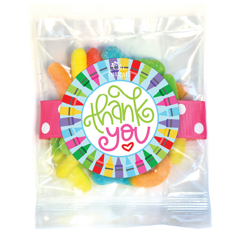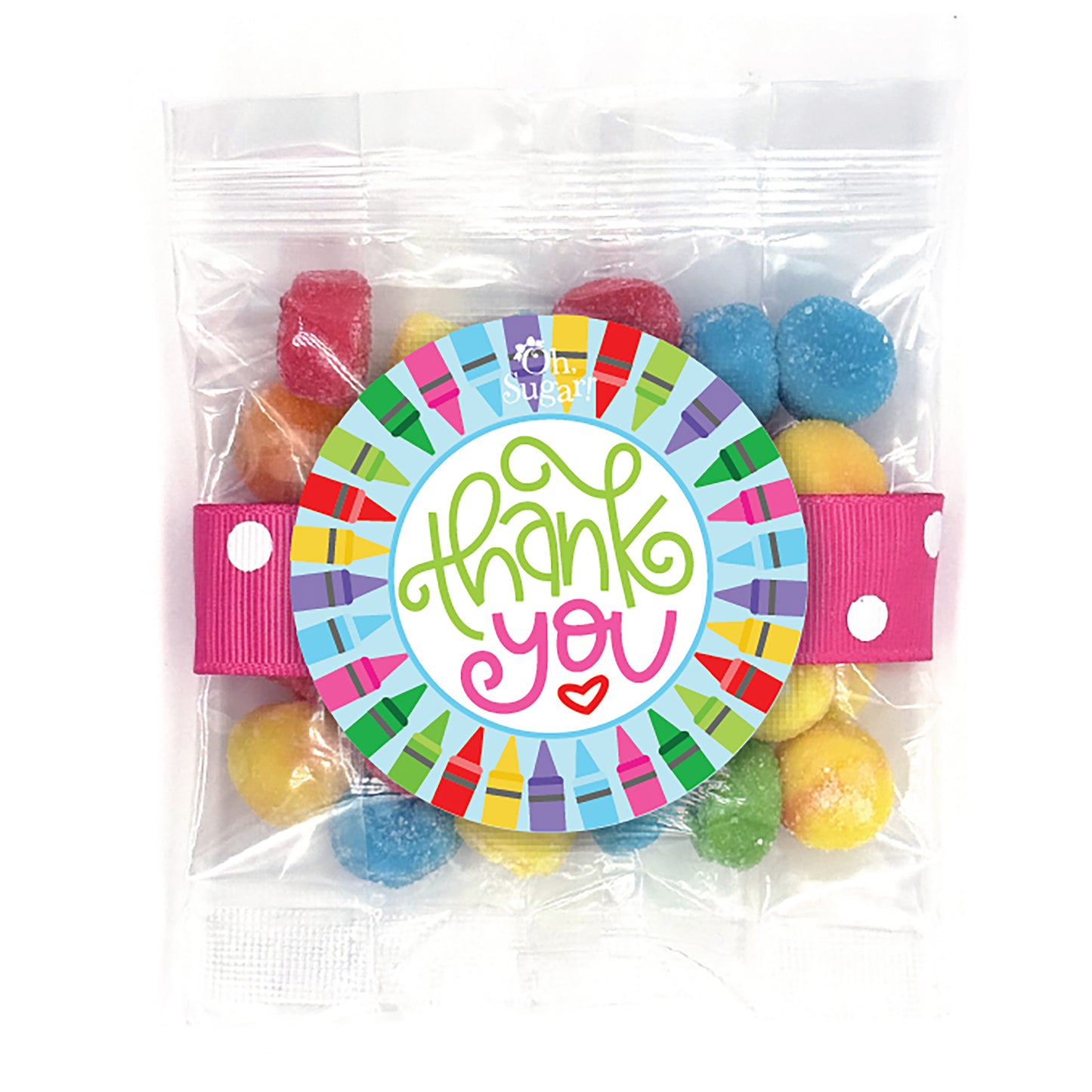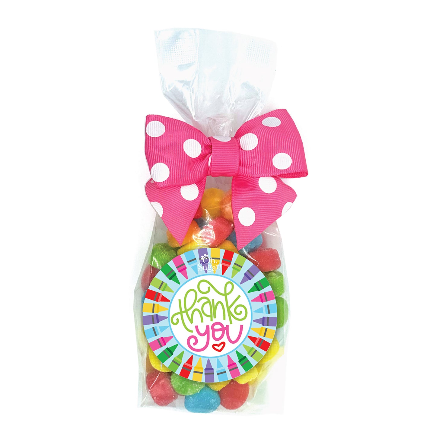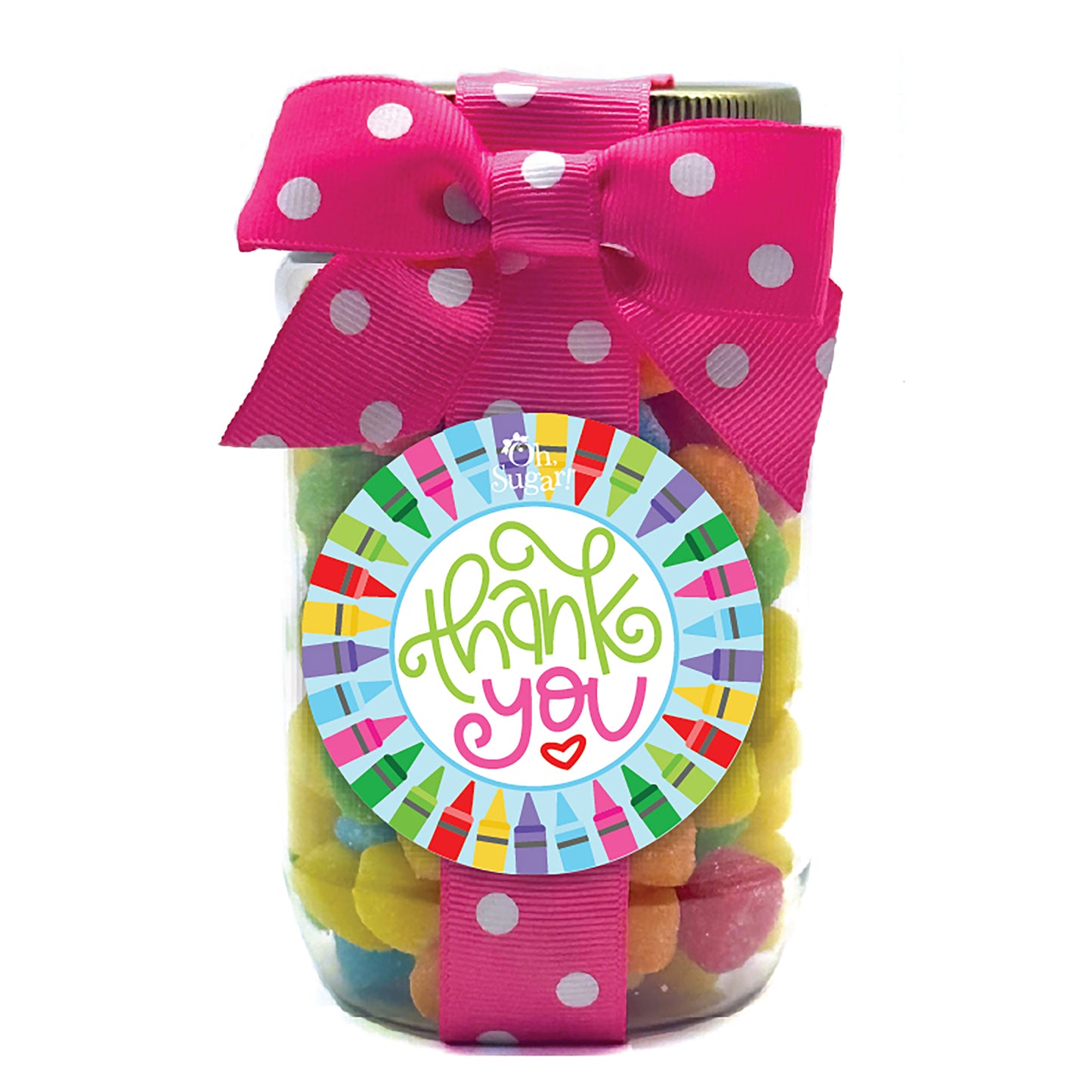 This plastic pint jar has about 13 ounces of candy. The regular treat bags have 6 ounces of candy. The small treat bags have 3 ounces of candy each. The jar and bags are decorated with pink ribbon and has a Teacher themed label.