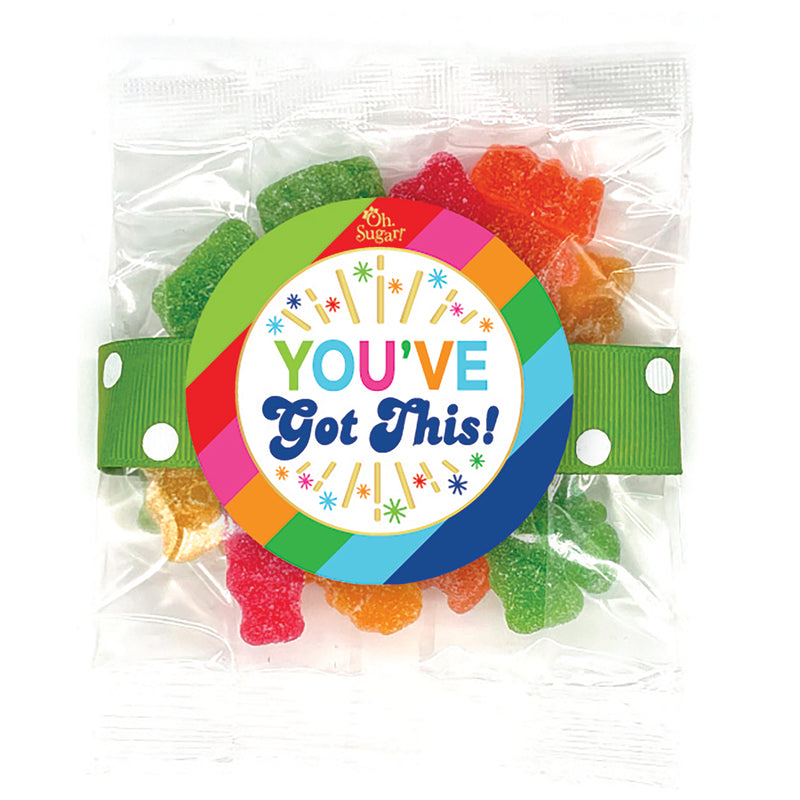 Depending on your candy selection (some candy weighs more than others) the plastic pint jar holds between 9oz - 13oz of candy. The regular treat bag holds 4oz - 6oz of candy and comes with a twist tie bow. The small treat bags have 2oz - 3oz of candy each. The jars and bags are decorated as shown.