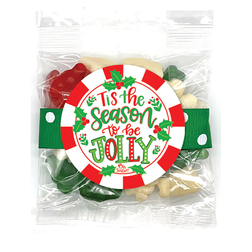 This plastic pint jar has about 13 ounces of candy. The regular treat bags have 6 ounces of candy. The small treat bags have 3 ounces of candy each. The jars and bags are decorated with red and green ribbon and has a Holiday themed label.