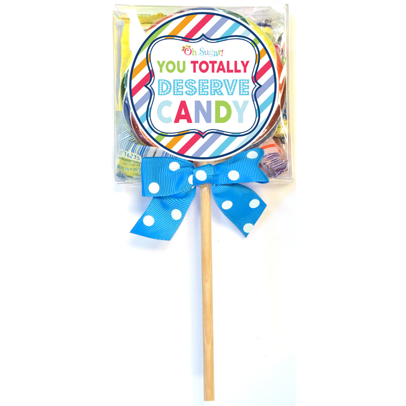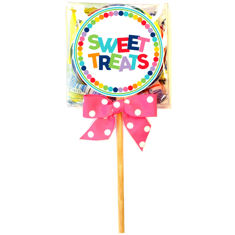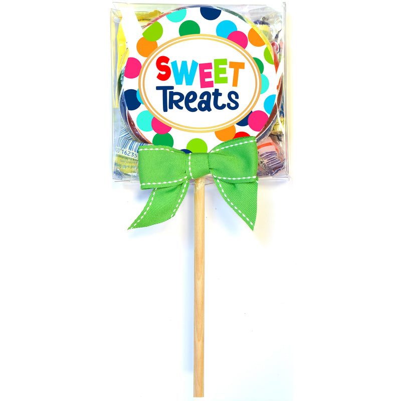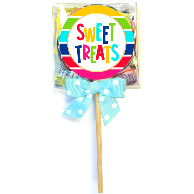 Our Mix Up Pops are always a crowd favorite. We take a 3" Whirly Pop and put in in a clear box with assorted wrapped candies. To top if off, we add a cute label and matching bow. Choose from 6 fun designs!